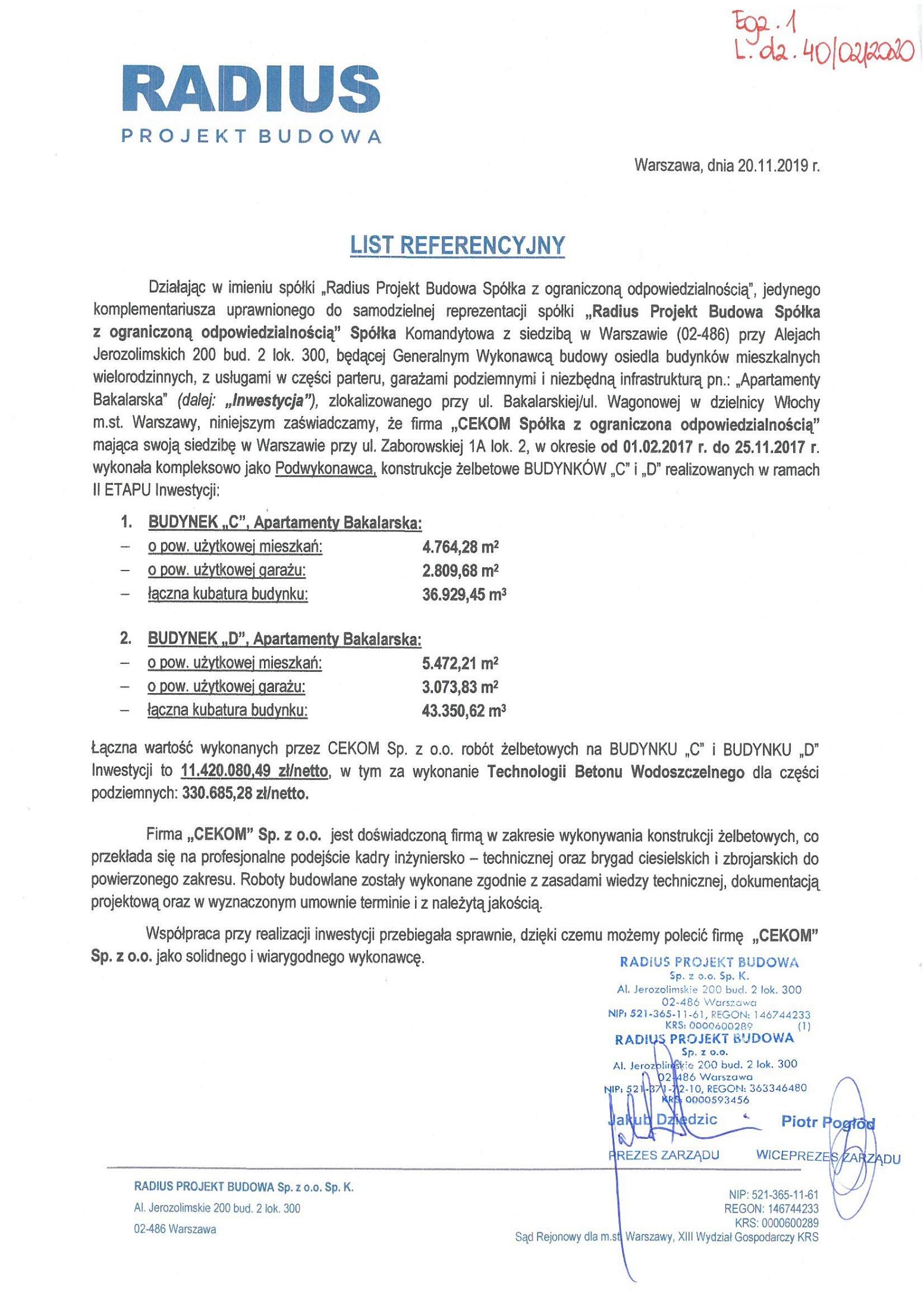 Zadanie: Budowa zespołu budynków mieszkalnych wielorodzinnych z usługami w parterze, garażem podziemnym, drogami, chodnikami, parkingami, elementami zagospodarowania terenu oraz niezbędną infrastrukturą techniczną pn. „Apartamenty Bakalarska” – Etap II (budynek C+D), Warszawa, ul. Bakalarska róg Wagonowej.